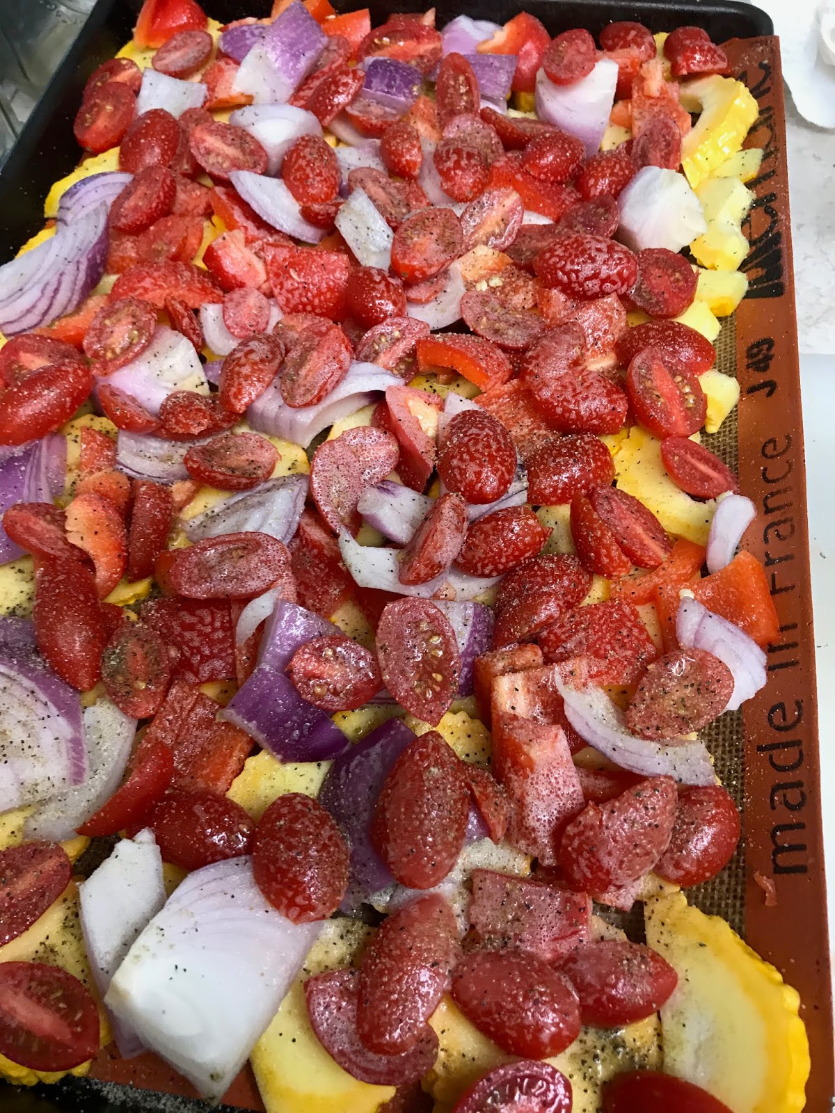 Sliced, then chopped, one large red onion and placed on top of the red peppers.